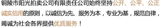 •       銅陵市陽光拍賣有限責任公司是經原安徽經貿委批準設立。公司成立于2003年,公司擁有自置的辦公大樓且擁有較強的專業技術隊伍,其中,國家注冊拍賣師6名,房地產估價師、會計師等專業人員齊全。公司自成立以來,經營業績優秀,在銅陵市拍賣行業中連續保持第一名的優異成績!2017年12月公司被中國拍賣行業協會授予“中國拍賣行業協會AAA級企業”資質,是銅陵地區目前唯一獲得此項資質的企業,全國近9000家拍賣公司僅有148家獲此榮譽,而安徽省僅5家。